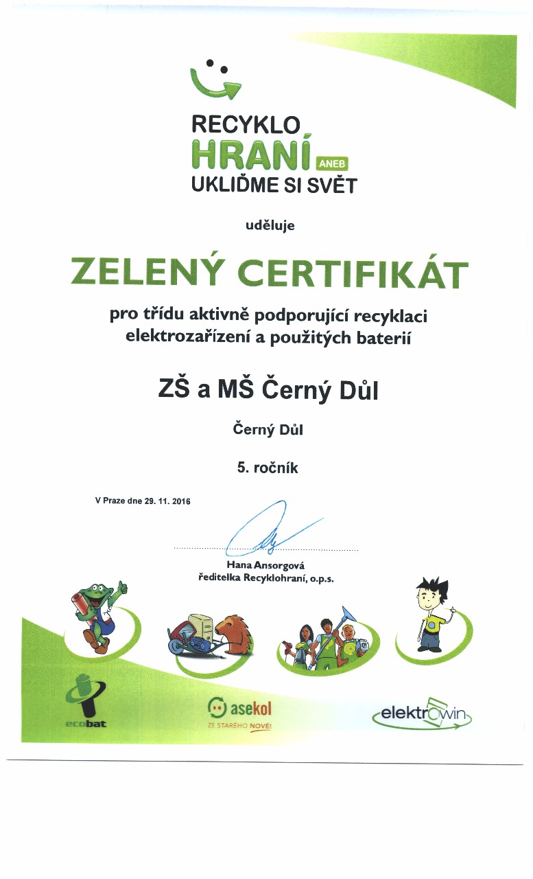 V úterý 29.11.2016 jsme si znovu připomněli pravidla třídění odpadu pod vedením zkušené lektorky. všechny ročníky obdržely zelený certifikát pro třídu aktivně podporující recyklaci elektrozařízení a použitých baterií.